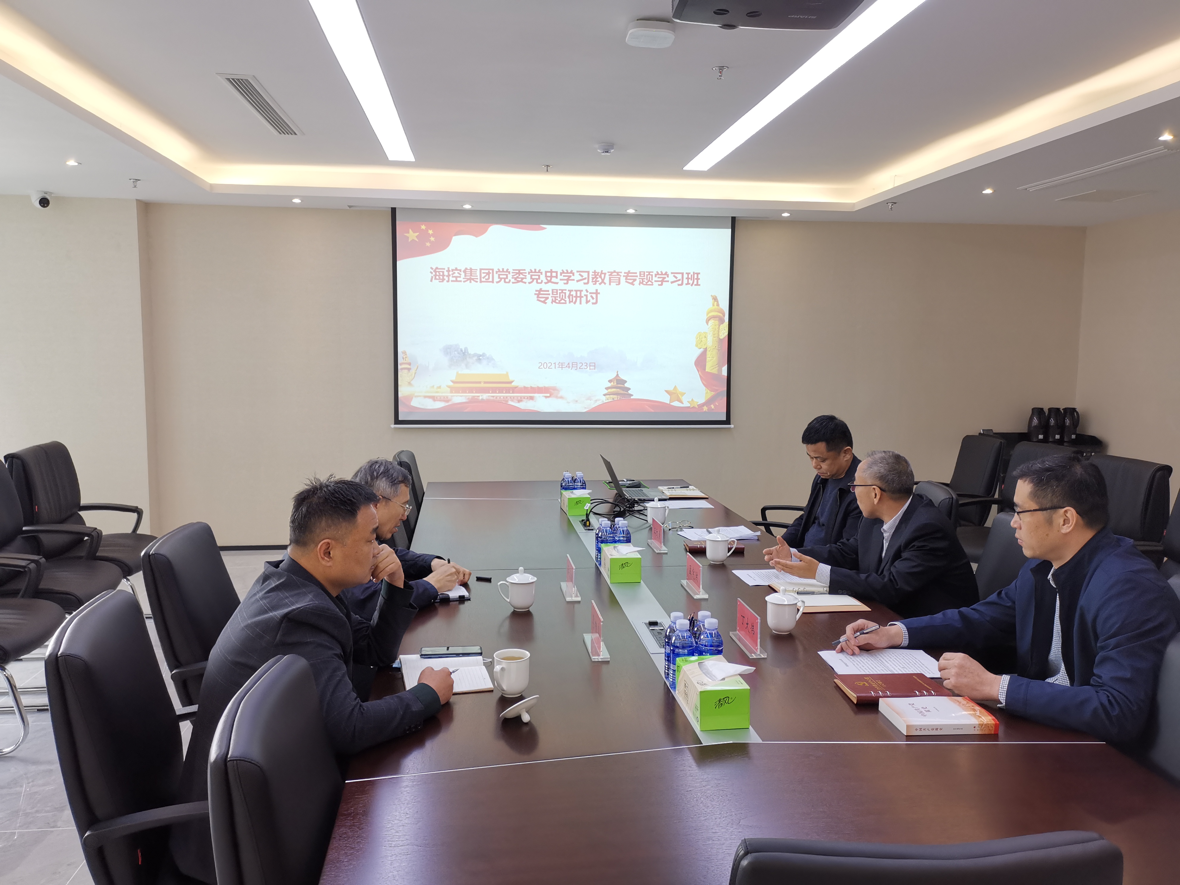 4月23日上午,??丶瘓F黨委組織開展黨史學習教育專題學習班集體研討。黨委班子成員孟憲洪、王文景、丁大偉同志出席研討會,工委(區委)黨史學習教育工作第八巡回指導組組長薛福建同志參會指導。